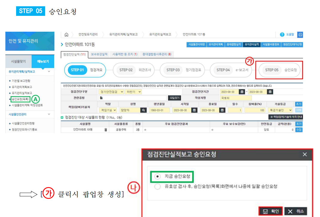 매뉴얼에는 유지관리 실적으로 예시되고 있긴 한데, 일반 안전점검/진단에서는 점검진단실적보고에서 승인요청하는 것을 STEP 05 단계로 말하는 것 같다.