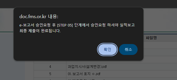FMS에서 e보고서제출을 하고(FMS메인페이지에서 e보고서제출 버튼을 눌러진행한 경우) 승인요청을 누르면 아래와 같은 창이 뜬다.