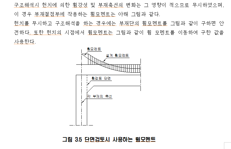 by ✯부재 단면력을 해당 절점이 아닌, 특정위치에서 따야 할 경우가 많다. 아래는 도로암거 표준도(2008) 기준에 나오는 내용 중에 발췌한 것인데 수평부재의 단면력을 구하는 위치를, 수직부재 면의 연장선을 그어서 정하는 내용이 들어 있다.