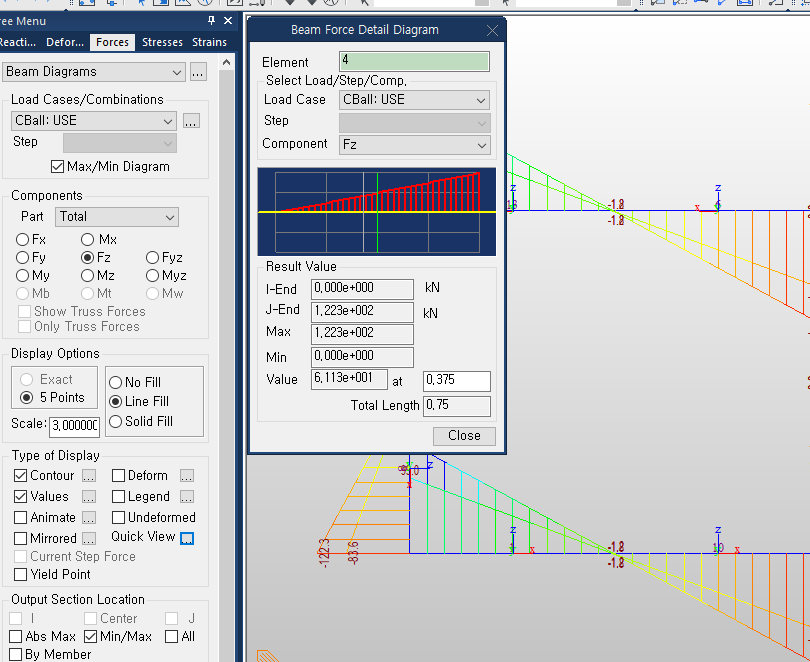 하지만 마이다스의 단면력 Result 기능에 BMD나 SFD에 특정 위치까지만 작도되게 하는 기능은 없다. 그러므로 Type of Display의 Quick View 기능을 이용해서 해당 요소 번호를 입력해서 특정위치의 단면력을 확인하는 수 밖에 없다. 이때 중요한 것은 요소의 Local Axis를 잘 확인해야 한다는 것이다.