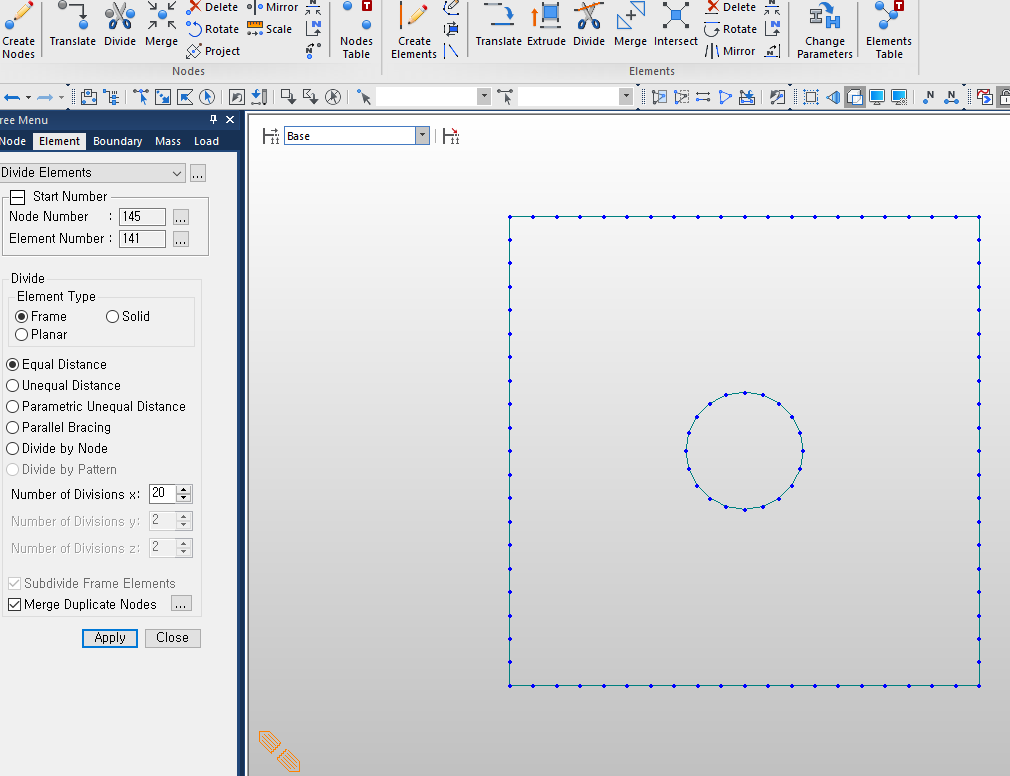 우선 구멍날 모양의 원형 요소를 생성한다. 이 때 Create Line Elements On Curve 기능 등을 이용하는 것이 가장 쉽다.