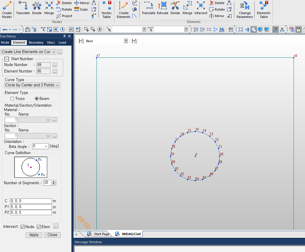 그리고 세그먼트 수를 조금 신경써야 하는데 원의 위,아래,오른쪽,왼쪽 점을 만들려면 4의 배수로 입력하는 것이 좋다. 이 기능으로 원을 만들 때 P1점을 시작점으로 해서 시계방향으로 세그먼트를 만들게 된다. 미리 만들어 놓은 두 개의 점 중에 P1는 시작점이고 입력된 세그먼트만큼 새 노드들과 요소들이 생성되게 되는데 P2와 상관없이 Segments수만큼 새로 만들어진다. 아래의 경우에는 Segements 수가 4의 배수일 때 P2점과 저촉되어 P2위치에 결국 노드가 2개로 중첩되지 않을까 싶기도 하겠지만, 중첩은 되지 않았다.