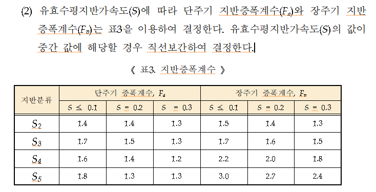 S값을 이용해 지반증폭계수를 위의 표를 이용해 산정한다면, S는 유효수평지반가속도가 아니라 '유효수평지반가속도계수'가 되어야 하는 것이 아닐까.