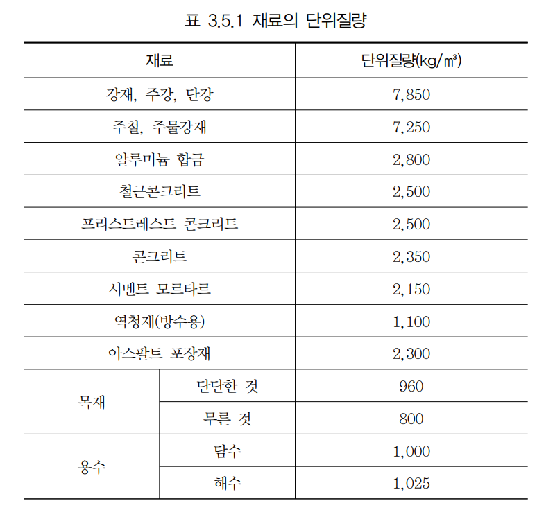 이 기준에서는 희한하게도, 재료의 단위중량을 특별한 경우를 제외하고는 건설공사표준품셈에 따른다고 되어 있다.